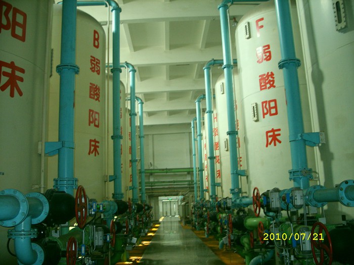 钢衬胶混床,正常工作时,阴阳离子树脂按一定比例合在一起进一步去除水中溶解性离子,设计不同组合其出水电导可达到1~18M-cm 。均匀混合的树脂层中,阳树脂与阴树脂紧密地交错排列,每一对阳树脂与阴树脂颗粒似于一组复床,混床就象无数组串联运行的复床。通过混合离子交换后进入水中的氢离子与氢氧离子会立即生成电离度很低的水分子(H2O),很少可能形成阳离子或阴离子交换时的反离子,因而能制取纯度相当高的成品水。